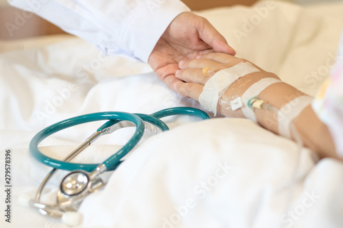 © Khunatorn, Fototapeta premium Doctor and child patient in hospital concept. Hand of kid physician philanthropy holding illness illness inpatient lying on hospital bed with chart and stethoscope