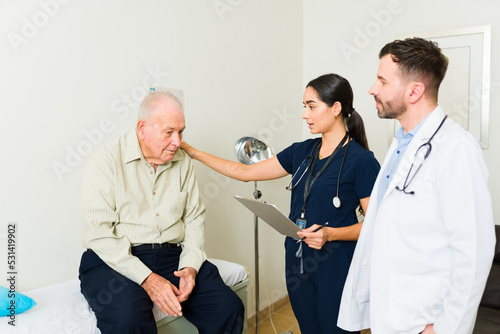 Obraz premium Doctor and nurse giving a medical treatment to an old man