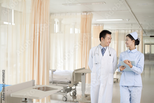 © Blue Jean Images, Fototapeta premium Doctor and nurse talking and walking together