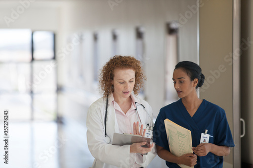 © Sam Edwards/KOTO, Obraz premium Doctor and nurse talking in hospital hallway