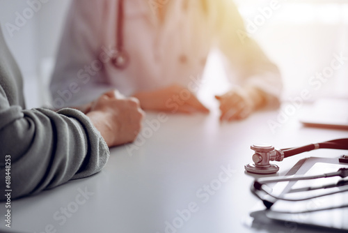 © rogerphoto, Fototapeta premium Doctor and patient are sitting and discussing something at the desk in the clinic office. The focus is on the stethoscope lying on the table, close up. Perfect medical service and medicine concept