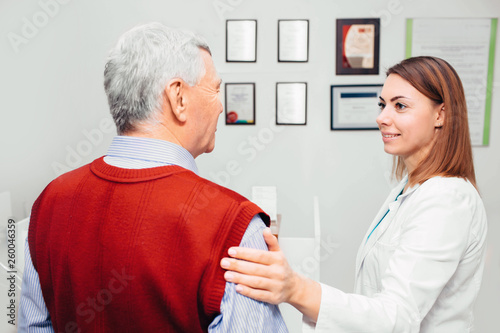 Fototapeta premium doctor comforting senior patient during a checkup at clinic