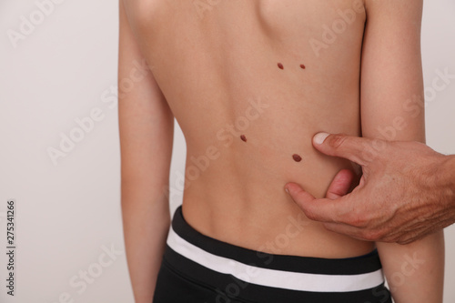 © dream@do, Naklejka premium Doctor dermatologist examines child patient birthmark close up. Mole checkup. Skin tags removal