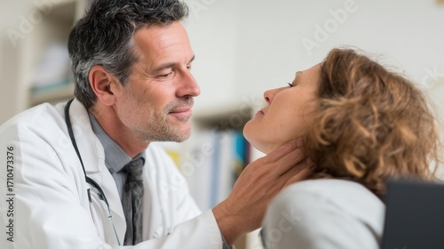 Obraz premium Doctor examining a female patient’s neck during medical consultation.