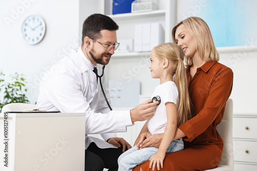 Fototapeta premium Doctor examining little girl with stethoscope and her mother in hospital