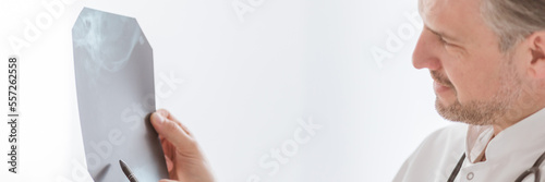 Fototapeta premium Doctor examining lung's x-ray at bright hospital office