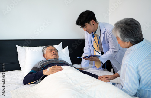 © PINA, Fototapeta premium doctor explaining medical treatment for bedridden patient elderly hopeless senior man lying on bed. home caregiver nurse visit retirement patient for health check up recovery process medical service
