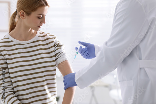 Fototapeta premium Doctor giving injection to patient in hospital. Vaccination concept