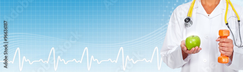 © grinny, Naklejka premium Doctor hands with apple and dumbbell.