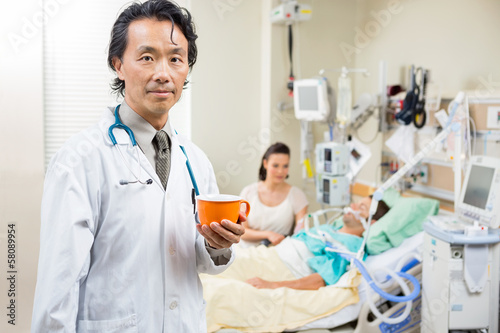 © Tyler Olson, Obraz premium Doctor Holding Coffee Cup With Patient Resting In Hospital