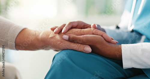 Fototapeta premium Doctor, holding hands or elderly patient with empathy for comfort, healthcare or consultation at retirement home. Closeup, nurse or caregiver with touch for support, assisted living or sympathy