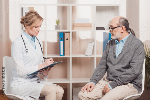 Fototapeta premium doctor in white coat with notepad listening to patients complaint in clinic