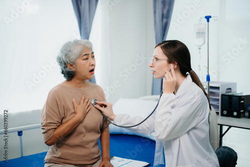 Fototapeta premium Doctor in white suit take notes while discussing and Asian elderly, woman...
