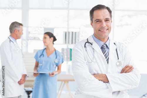 Fototapeta premium Doctor looking at camera while his colleagues works