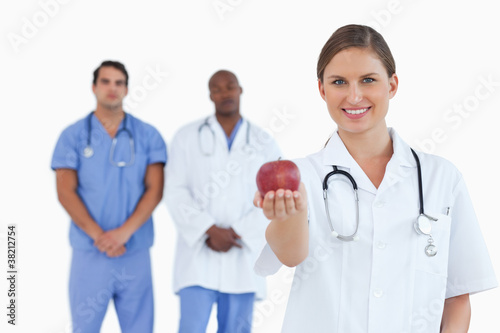 Fototapeta premium Doctor offering apple with colleagues behind her