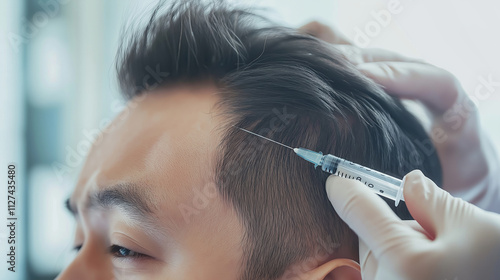 © Bonsales, Fototapeta premium Doctor performing prp treatment on asian man, injecting plasma into scalp to stimulate hair growth and combat hair loss