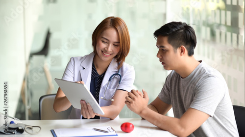 © bongkarn, Fototapeta premium Doctor presenting a patient some information on a digital tablet
