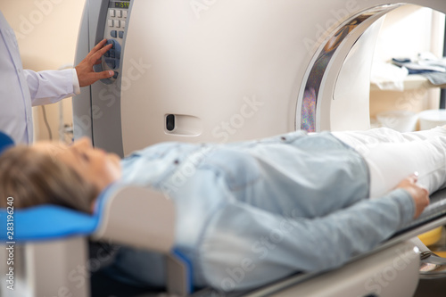 Obraz premium Doctor pressing button on CT scan machine
