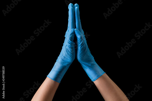 Fototapeta premium Doctor's hand in sterile medical gloves together symbolizing prayer isolated