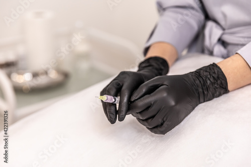 Fototapeta premium Doctor's hands in black glove with syringe.