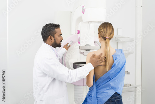 © Tyler Olson, Fototapeta premium Doctor Standing Assisting Patient Undergoing Mammogram X-ray Tes