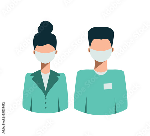 © AyaLinesDesign, Naklejka premium Doctor sticker icon in green mint shape. Man and woman doctor in flat style. Vector graphics