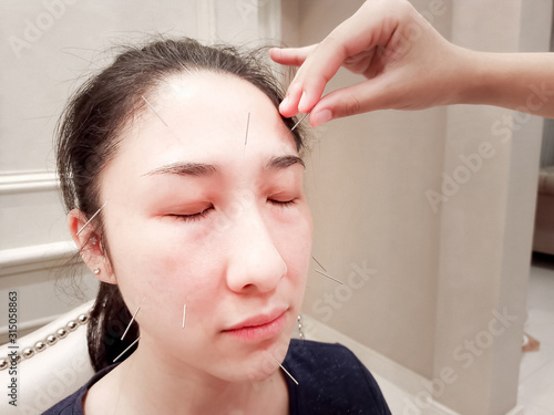 Naklejka premium Doctor sticks needles into the body on acupuncture . Acupuncture needles...