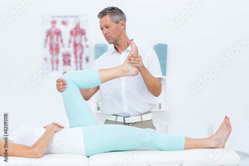 © WavebreakmediaMicro, Obraz premium Doctor stretching his patients leg