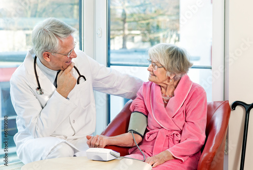 © belahoche, Obraz premium Doctor taking an elderly womans blood pressure.