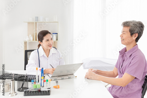 © jokekung, Obraz premium doctor talk with patient in mental health clinic, she screening and write patient information on patient chart, elderly healthcare promotion