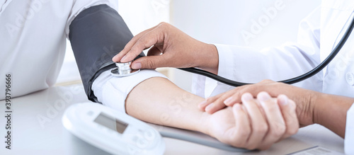 Fototapeta premium Doctor using a measuring blood pressure checking patient with examining,...