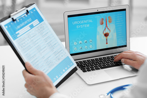 Fototapeta premium Doctor with laptop and laboratory test sitting at table in office