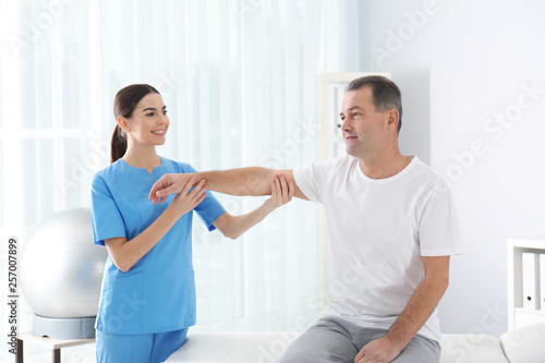 Fototapeta premium Doctor working with patient in hospital. Rehabilitation physiotherapy