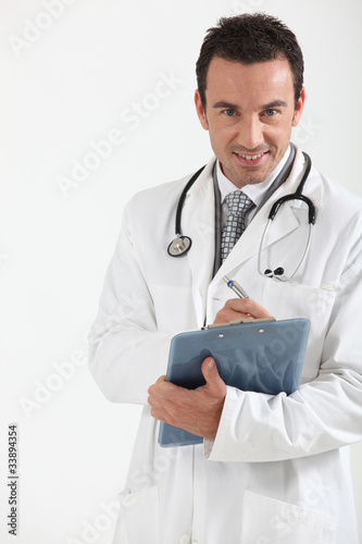 Fototapeta premium Doctor writing on clipboard smiling