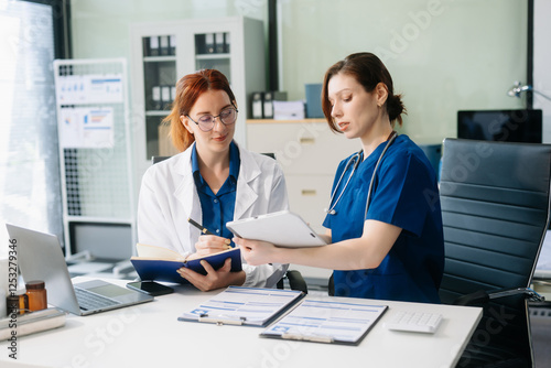 © Nuttapong punna, Fototapeta premium Doctors and nurses collaborating in a modern medical office, showcasing teamwork and patient care.
