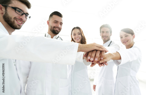 Fototapeta premium Doctors and nurses in a medical team stacking hands