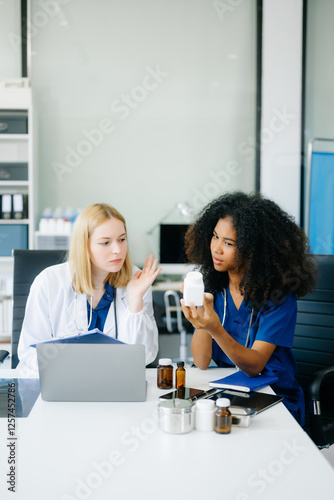 Fototapeta premium Doctors and nurses using laptops and clipboards, showcasing teamwork, modern...