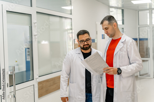 Obraz premium Doctors are discussing medical issues. Standing at hospital with papers in hands.