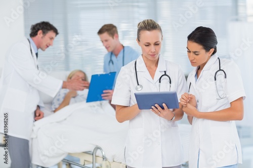 Fototapeta premium Doctors looking at clipboard while theirs colleagues