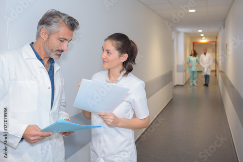 Fototapeta premium Doctors looking at notes in hospital corridor