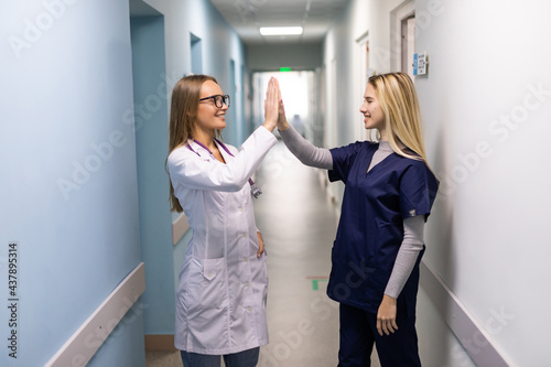 Fototapeta premium Doctors Team of Surgery gives High Five motivation in a clinic