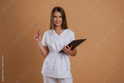 © standret, Fototapeta premium Documents in hands. Young pretty woman is against background in the studio