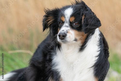 Fototapeta premium Dog a Mini Australian Shepherd smelling the wind, dishevelled fur
