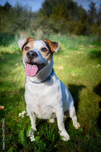 Obraz premium dog, beagle, pet, animal, puppy, cute, portrait, white, canine, brown, grass, terrier, breed, pedigree, mammal, domestic, adorable, young, isolated, doggy, sitting, purebred, happy, pets, small