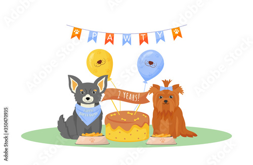 © IMG visuals characte, Obraz premium Dog birthday flat color vector character. Cute puppy in festive hat. Safe cake for domestic animal. Pet bday celebration isolated cartoon illustration for web graphic design and animation