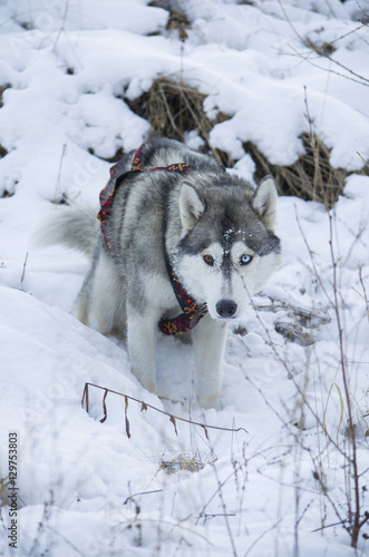 Fototapeta premium Dog breed "Husky" walking in a winter forest.