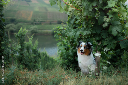 © Anna Averianova, Obraz premium dog by the grape tree. Field, greens. Marble Australian Shepherd in nature.