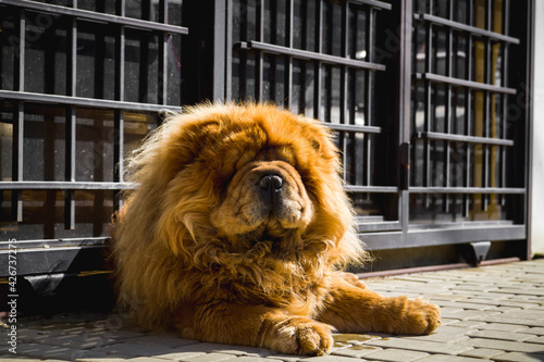 Fototapeta premium Dog chow chow breed lies on the ground pet