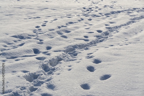 © Valeria, Naklejka premium Dog footprints in the snow. Slovakia