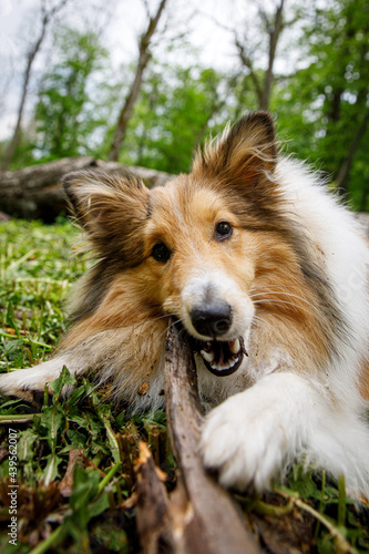 © 9parusnikov, Fototapeta premium Dog holding a stick in the forest.